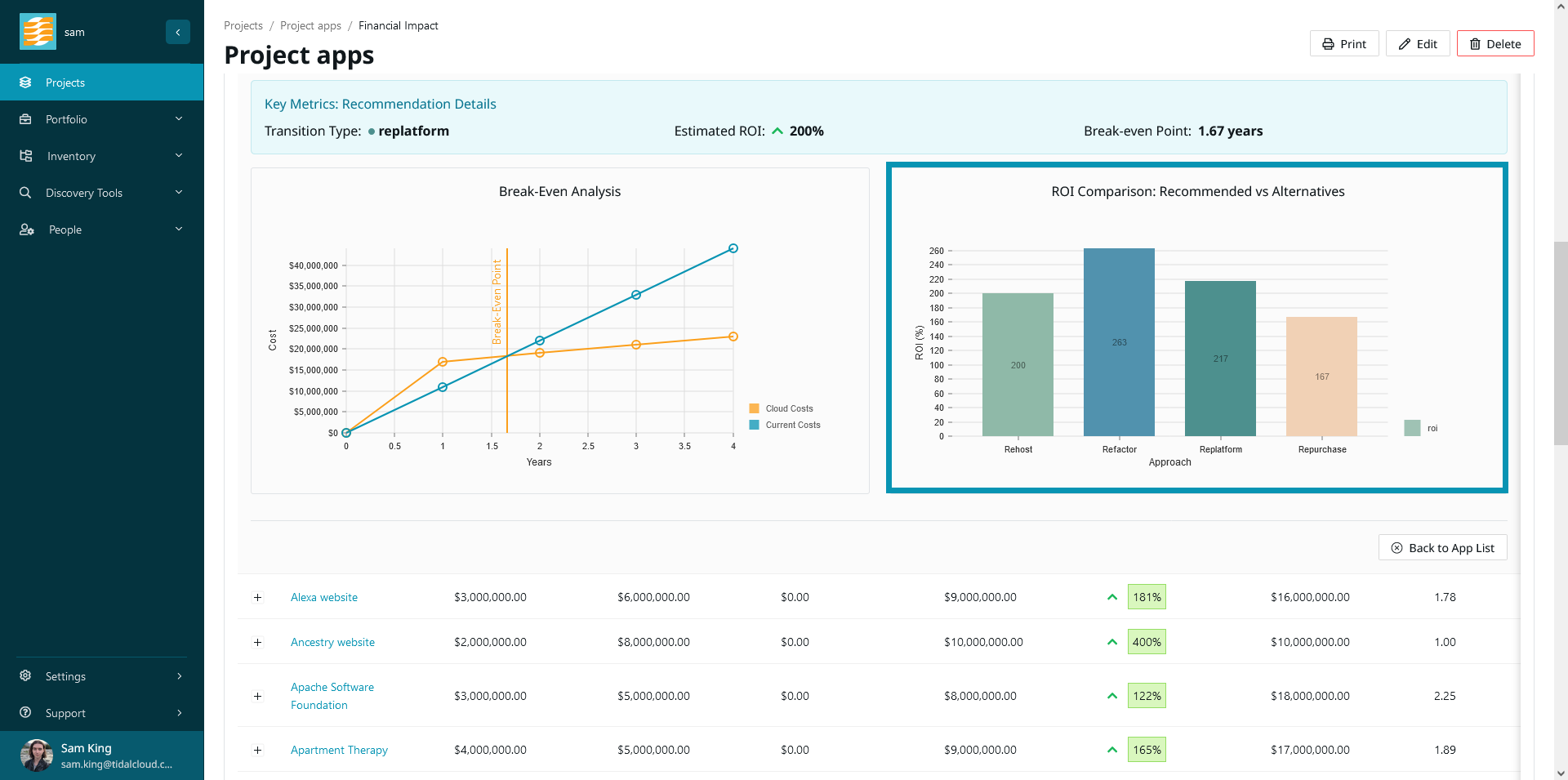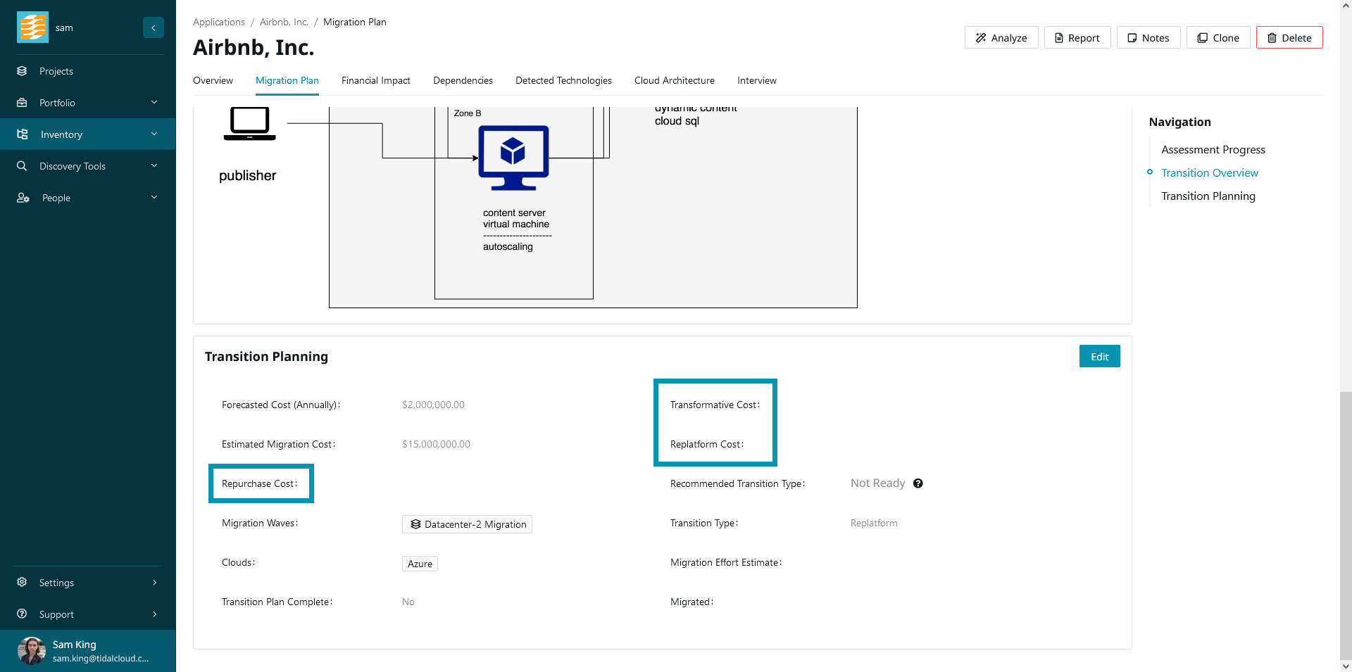 Arguably the most important data you’ll be dealing with is the current cost and cloud cost for your apps. For the most part, ‘cloud costs’ refers to rehost costs, however we do allow you to visualize and compare ROIs for alternative cloud migration transition types. More on that later.