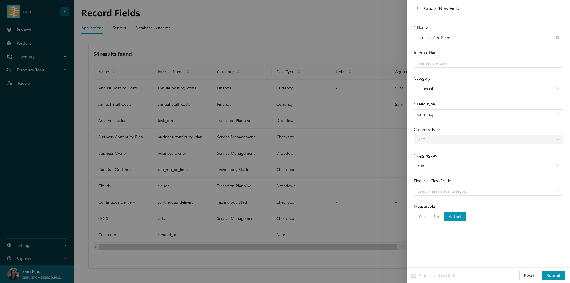 Do you have a cost which is not covered by existing fields? Maybe you pay a license cost for this app, for example. That’s easy to add, simply navigate to settings -> fields and create a new custom field by clicking the ‘+ New’ button. The category you choose for this field determines whether it is a current or a cloud cost. For a current cost, select the ‘Financial’ category, and for a cloud cost, select the ‘Cloud Financial Estimates’ category. You can also set a financial classification at this point as described here. The appropriate classification in this example would be ‘License’.