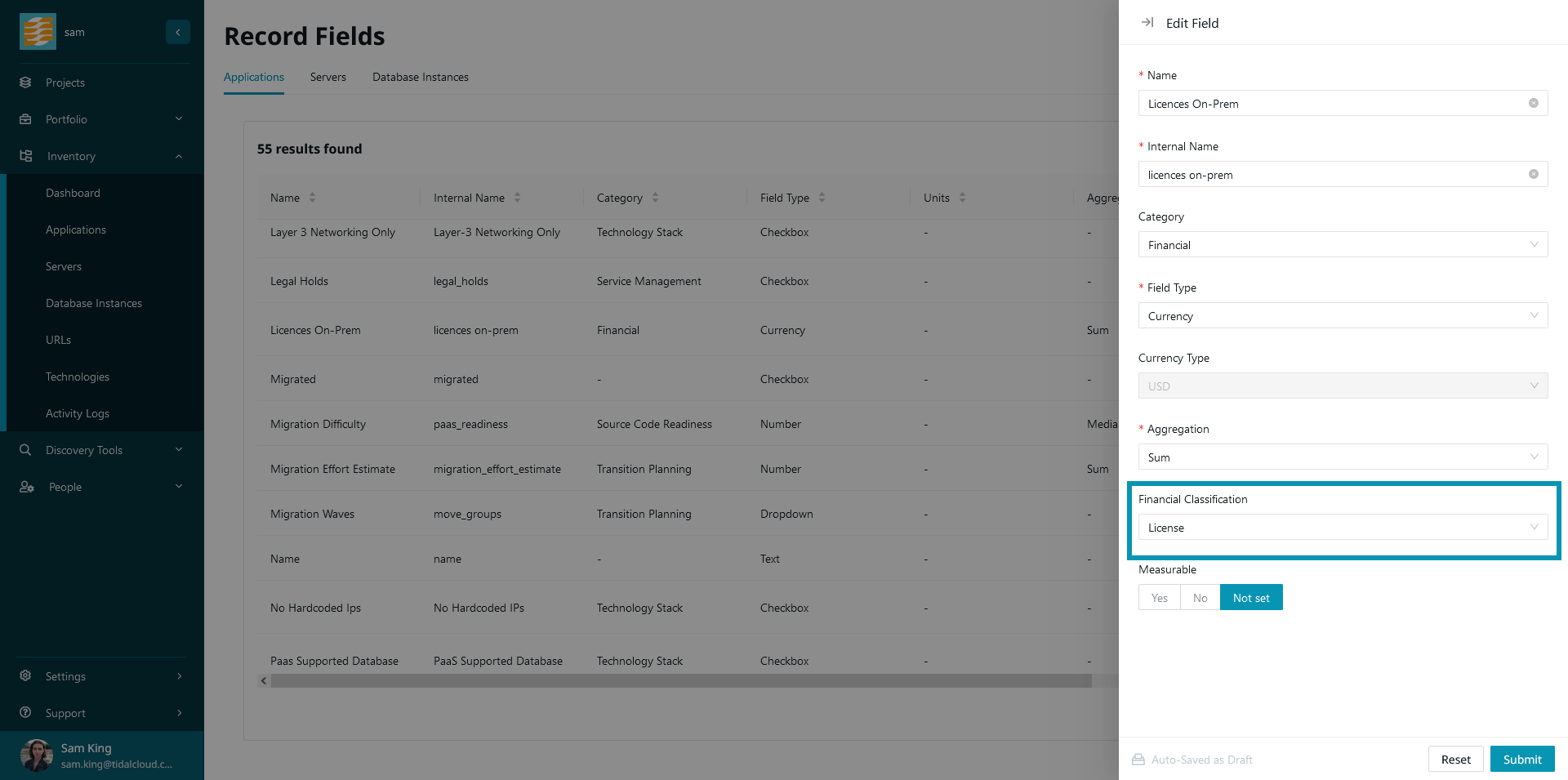 When creating a custom field where the category is ‘Financial’ or ‘Cloud Financial Estimates’ and the field type is ‘Currency’, you’ll notice that there is an additional attribute available - ‘Financial Classification’. This allows you to distinguish between different cost types, such as license or maintenance costs.